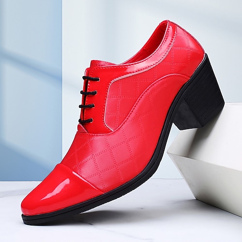scarpe da uomo in similpelle con tacco alto rosse – finitura lucida classica, punta affilata, tacco medio robusto, scelta elegante per ufficio, feste, matrimoni ed eventi serali