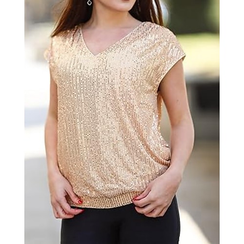 Per donna Maglietta Tinta unica Elegante Moda Classico Manica Corta Scollo a V Top Regolari Quotidiano Uscire Weekend Paillettes Blu Nero Rosa Vino Cachi Estate Primavera