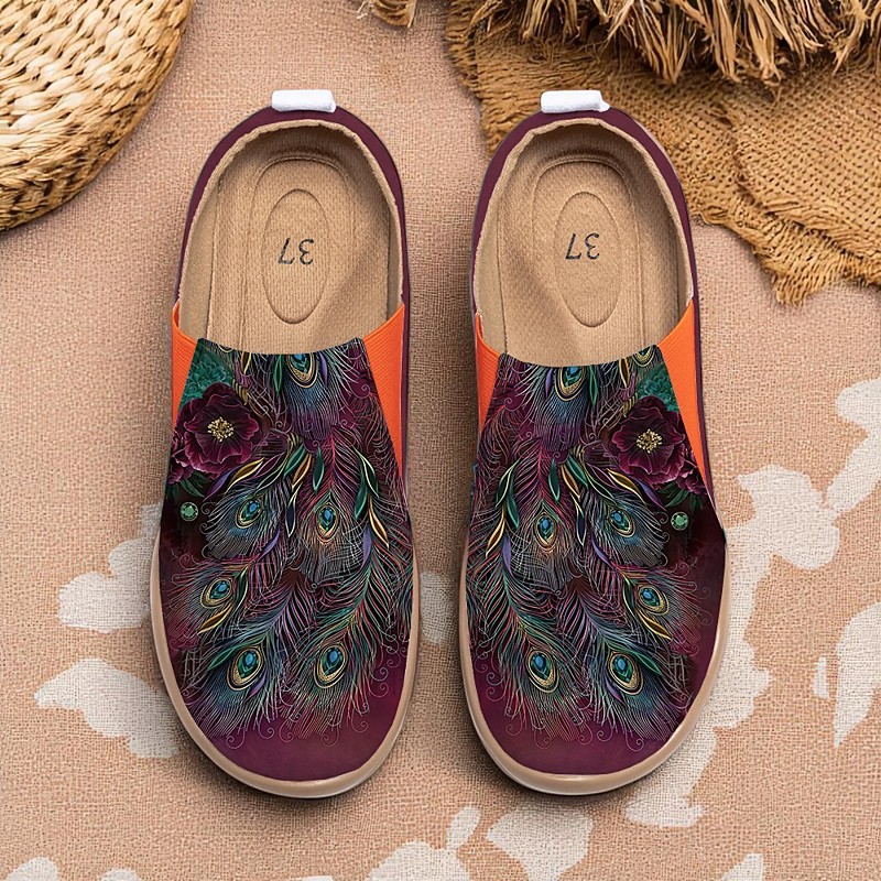 Women's Comfort Slip-On Barefoot Shoes—Artistic Peacock Print, Ergonomic Insole, Vibrant Resort Style, Great for Home, Garden, Art Festivals and Relaxed Travel Days