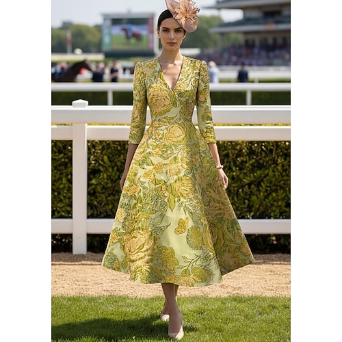 Linea ad A Lunghezza alla caviglia Abito da invitata a nozze Abito Formale Abito da sera Abito da cerimonia per signora Manica 3/4 Bavero Elegante Vintage Formale Ospite di nozze Semi-Formale Jacquard