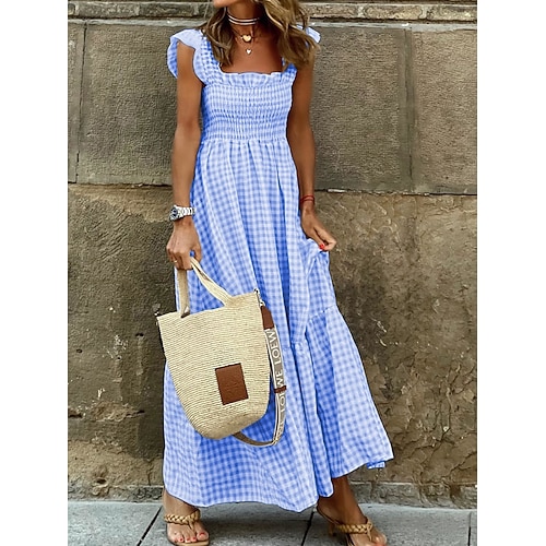 Per donna Abito maxi Abito a trapezio Abito Sottoveste Vacanza Casual All'aperto Uscire Vestibilità regolare Plaid Senza Maniche Spalline sottili Nero Rosso Azzurro cielo Beige Estate Primavera