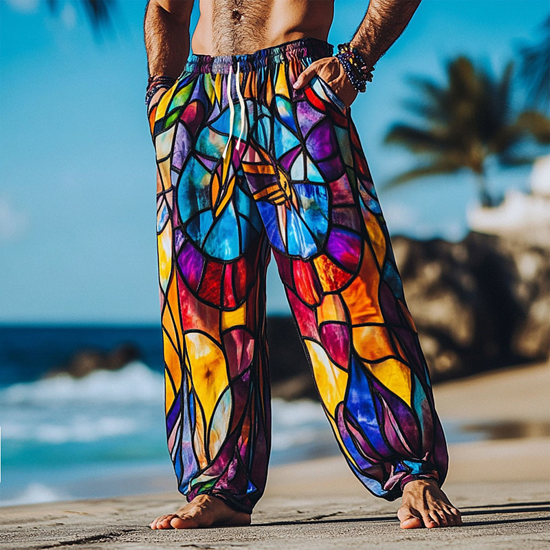Men's Plaid Patchwork Cathedral Window Trousers Casual Pants Mid Waist Drawstring Elastic Waist Hawaiian Vintage Retro Outdoor Vacation Holiday Side Pockets Straight Leg Trousers Summer Spring Fall