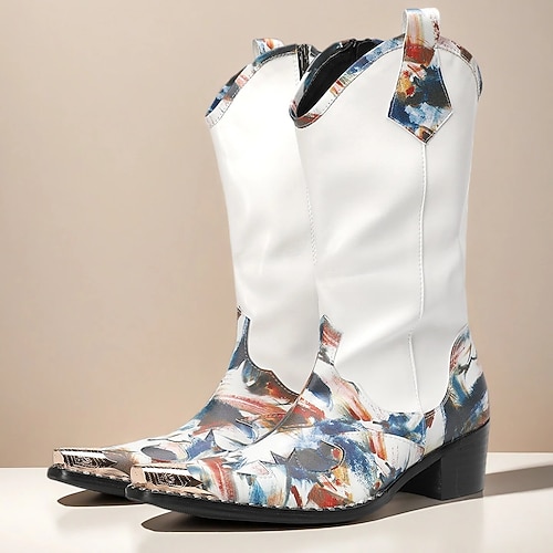stivali da cowboy da uomo in vera pelle bianca con stampa artistica e dettaglio fibbia: stile unico per incontri informali ed eventi speciali