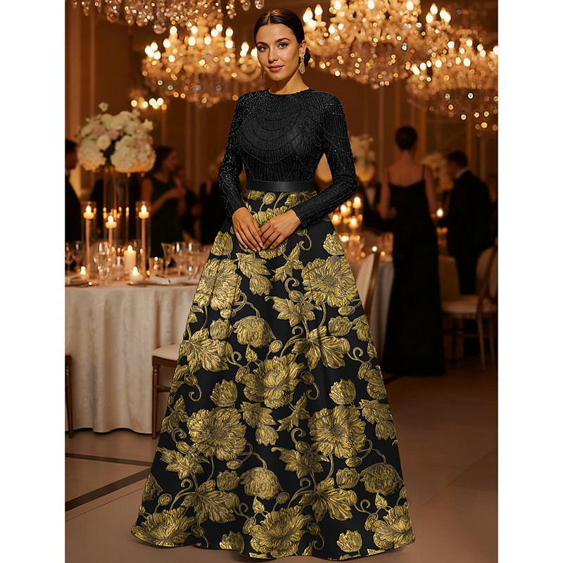 A-Line Floor Length Evening Gown Ball Gown Formal Dress Elegant Glittering Silky Long Sleeve Crew Neck Wedding Formal Pocket Sequined with Glitter