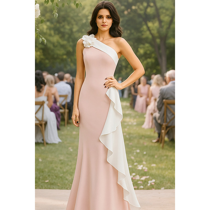 Mermaid Trumpet Floor Length Prom Dresses Evening Gown Ball Gown Elegant Sleeveless One Shoulder Wedding Formal Chiffon Stretch Crepe with Ruffles