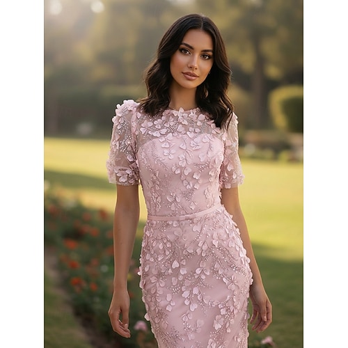 Tubino Colonna Lunghezza Tè Abiti da Cocktail Abito da Sera Abiti da festa Elegante Scintillante Stile Celebrità Manica Corta Girocollo Festa in giardino Matrimonio Pizzo con Perline Applicazioni