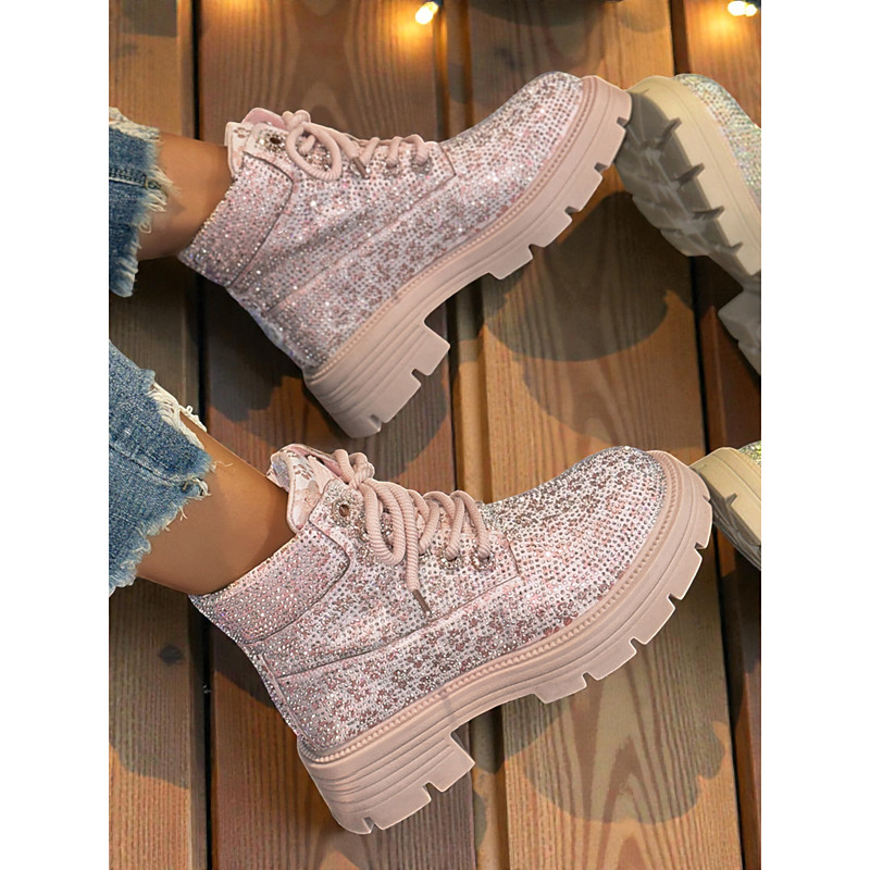 Women's Glitter Lace-Up Ankle Boots - Sparkly Rhinestone Chunky Platform Combat Boots, Trendy Nightlife Style for Parties, Clubs Evening Outfits