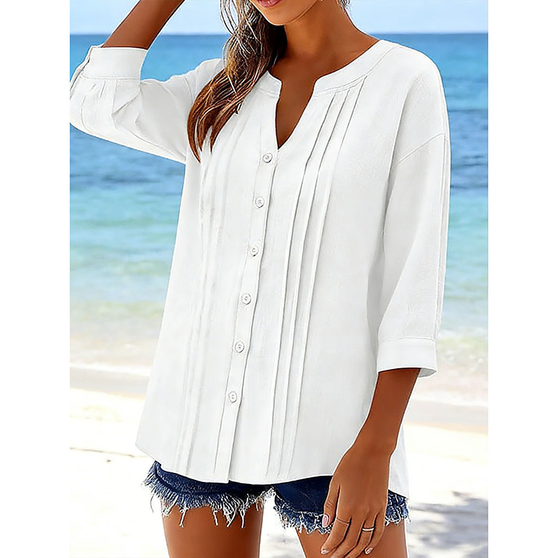 Women's Blouse Solid Color Elegant Vintage Stylish 3/4 Length Sleeve V Neck Long Tops Daily Work Ruched Blue White Navy Blue Brown Green Summer Spring