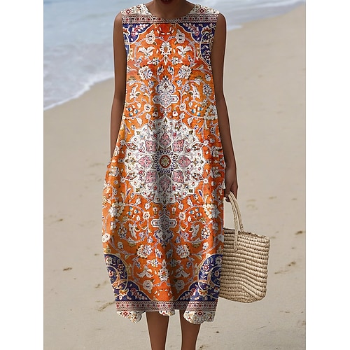Per donna Abito Midi Abito a Tubino Vacanza Casual Uscire Vestibilità regolare Grafico Geometrico Senza Maniche Girocollo Blu Rosso Arancione Verde Estate Primavera