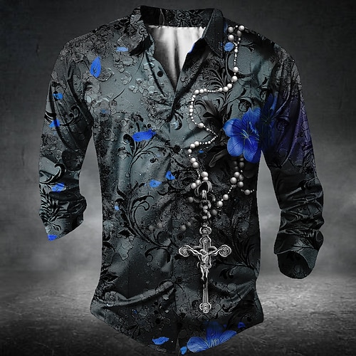 Herren Templer Kreuz Romantisch Rose Hemd Knopfhemd Langarm Dunkler Gothic-Stil Ferien Streetwear Sommer Frühling Umlegekragen 3D-Druck Hemden mit Kragen Rote Blau Purpur