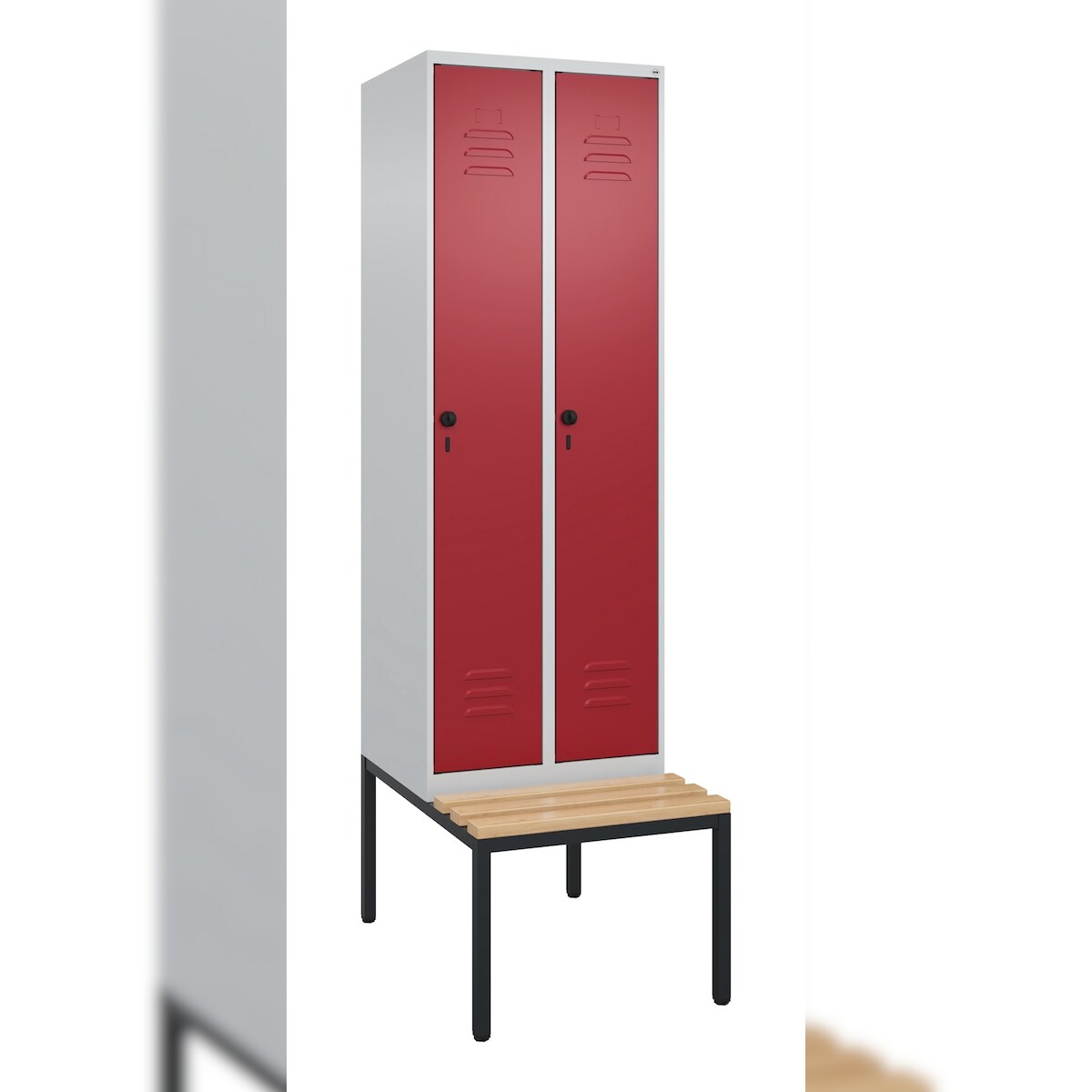 C+P Spind Classic PLUS, Buche untergebaute Sitzbank 2 Abteile, HxBxT 212x60x82cm, Sicherheitsdrehriegel, Hellgrau/Rubinrot von PROREGAL
