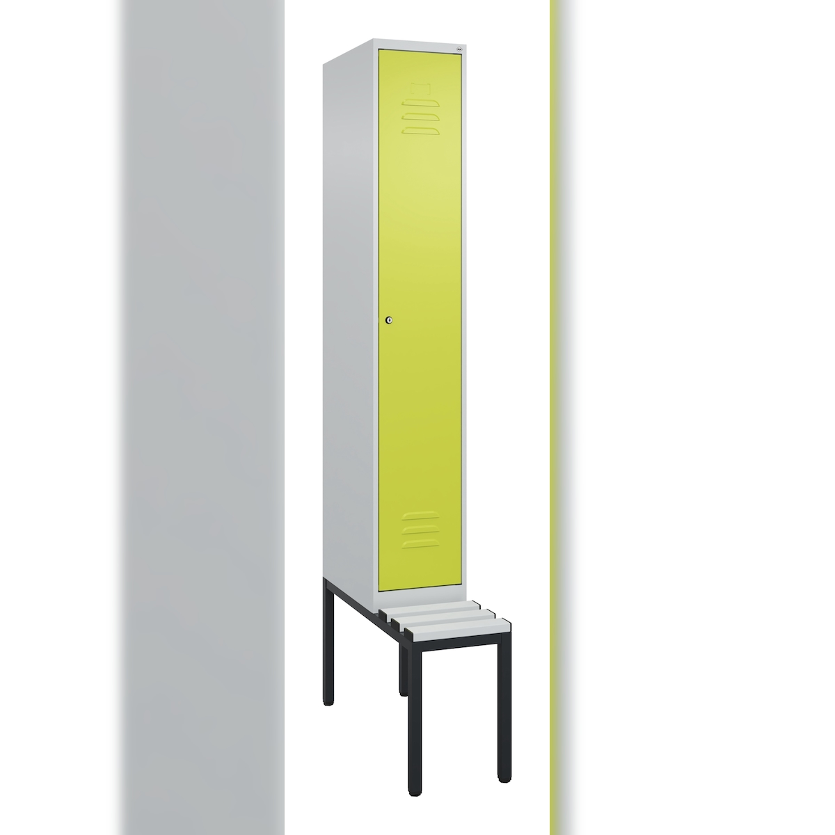 C+P Spind Classic PLUS, Kunststoff untergebaute Sitzbank, 1 Abteil, HxBxT 212x30x82cm, Zylinderschloss, Hellgrau/Clowngrün von PROREGAL