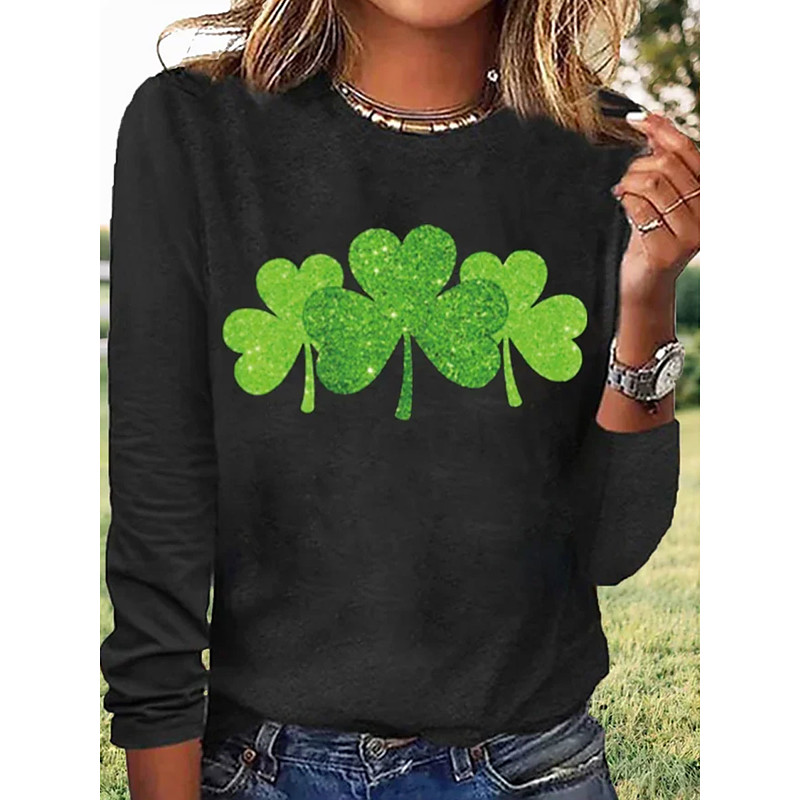 St. Patrick Women's T Shirt Plants Casual Long Sleeve Crew Neck Regular Tops Daily Print Black Spring Fall