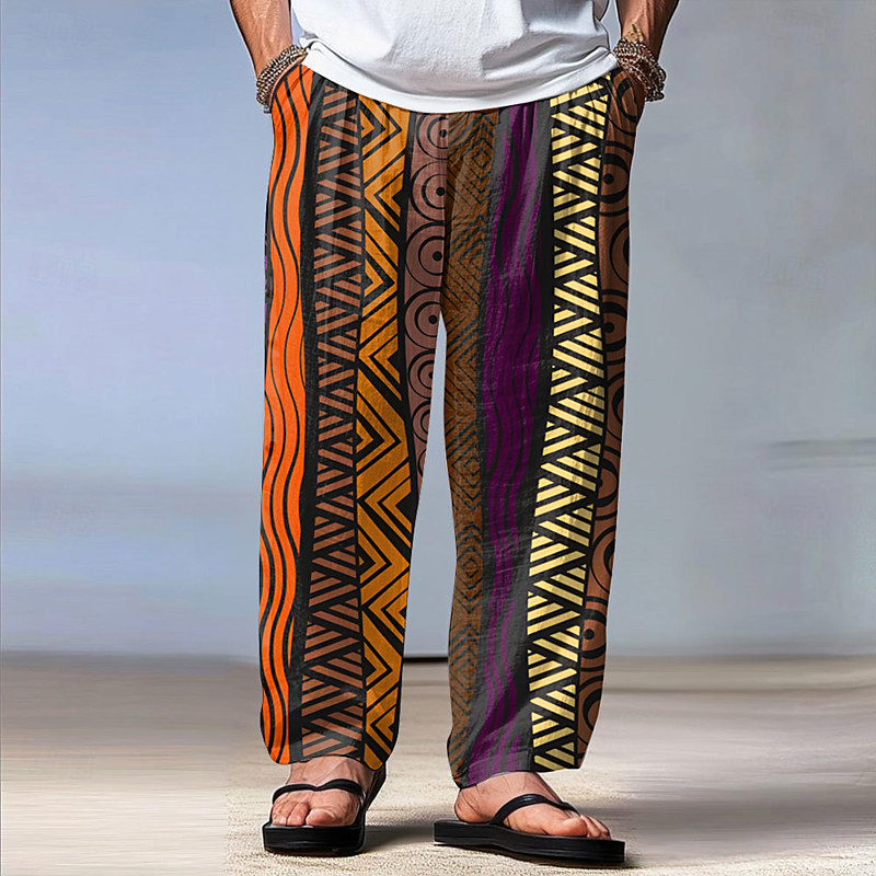 Men's Geometric Ethnic Trousers Baggy Pants Casual Pants Mid Waist Vintage Retro Outdoor Vacation Holiday Drawstring Elastic Waist Wide Leg Summer Spring 3D Print Orange Green