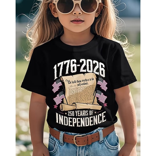 100% Cotone Bambini Ragazze Nero Grafico Bandiera USA 250° anniversario Bandiera americana per bambini Maglietta Girocollo Manica Corta Vacanza Sport Outdoor Abbigliamento Quotidiano Vacanza