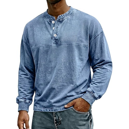 Per uomo Maglia Henley Camicia 100% cotone lavaggio acido Manica Lunga Henley Primavera Autunno Tutte le stagioni Tinta unica Vintage Retrò Vintage Casual Stile Vintage Lavato Casuale Blu chiaro Nero