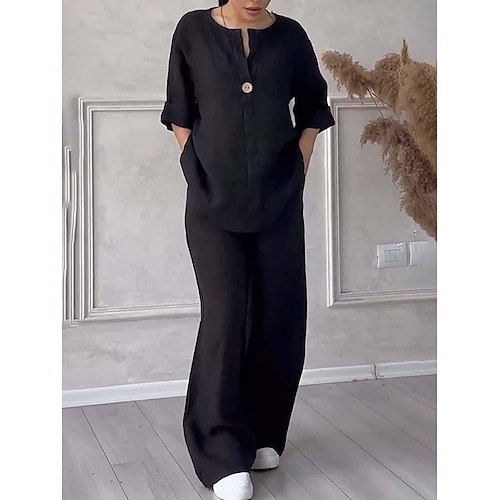 Per donna Moda Streetwear Quotidiano Camicia Set ispirati al lino Set da due pezzi Pantaloni a Gamba Larga Manica 3/4 Girocollo Semplice Casuale Quotidiano Nero Bianco Verde militare Estate