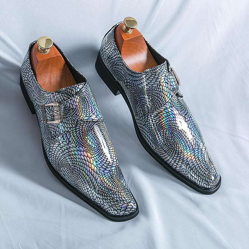 Men's Green Patent Leather Snakeskin Print Double Monk Strap Shoes with Buckle Detail - Stylish Formal Footwear for Fashion-forward Gatherings