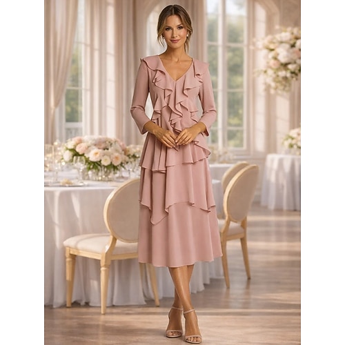 Linea ad A Lunghezza Tè Vestito Casual Abito Formale Abito da cerimonia per signora Manica 3/4 Scollo a V Elegante Pastello Formale Crêpe con Volant Balze a cascata