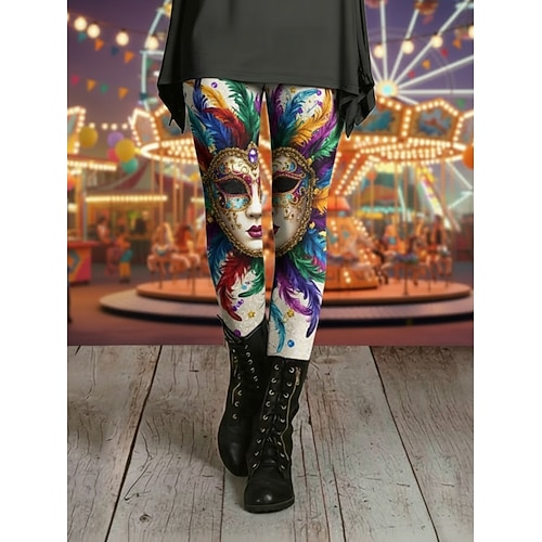Karnevals-Leggings für Damen, bequeme Leggings im Vintage- und Ethno-Stil, lange Hose mit hohem Bund, Grafikprint, bequem, dehnbar, lässig, für Alltag und Urlaub, in Blau, Weiß, Gelb, Lila, Frühling