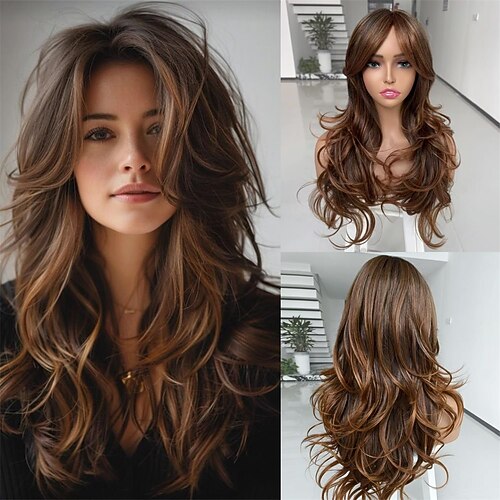 Parrucca sintetica con mèches castano scuro, biondo miele, lunga e ondulata a strati con frangia per donne bianche e nere, parrucca sintetica con mèches castano a strati con frangia a tendina, capelli