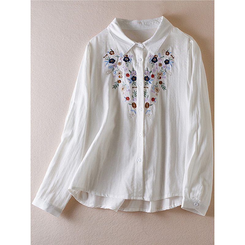 Women's Boho Shirt Dressy Tops Solid Color Floral Daily Casual Long Sleeve Bishop Sleeve Shirt Collar Regular Tops Work Daily Going out Embroidered White Spring, Fall, Winter, Summer