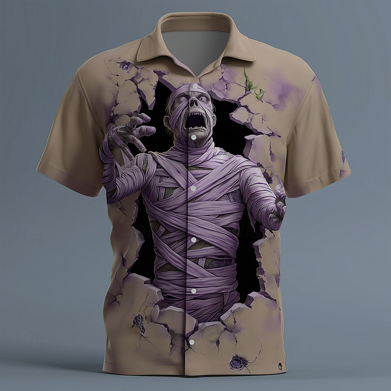 Halloween Men's Zombies Mummy Cracked Wall Shirt Button Up Shirt Short Sleeve Dark Gothic Style Holiday Streetwear Summer Spring Turndown 3D Print Collared Shirts Light Green Pink Purple Green Khaki