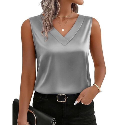 Per donna Camicia in raso Blusa Tinta unica Elegante Vintage Senza Maniche Scollo a V Top Regolari Quotidiano Lavoro Ferie Patchwork Blu Nero Bianco Rosso Viola Estate Primavera
