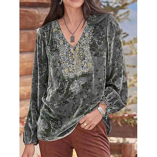 camicia da donna camicia boho camicetta velluto base stampa floreale manica lunga top regolari scollo a V festa capodanno giallo rosso viola grigio primavera autunno