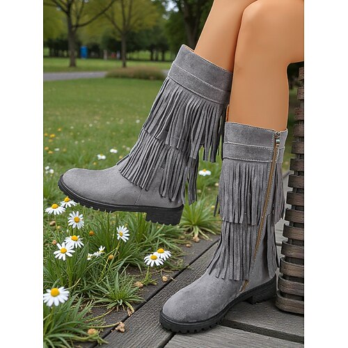 stivali da donna con frange marroni e nappe a strati – scarpe in stile cowboy western a metà polpaccio per festival musicali, concerti country e look boho