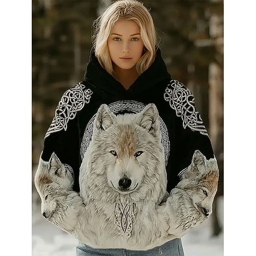 Felpa con cappuccio da donna in stile vichingo, grafica, animale, geometrico, vintage, casual, boho, manica lunga, con cappuccio, regular top, casual, street, patchwork, stampa, tasca frontale, nero,