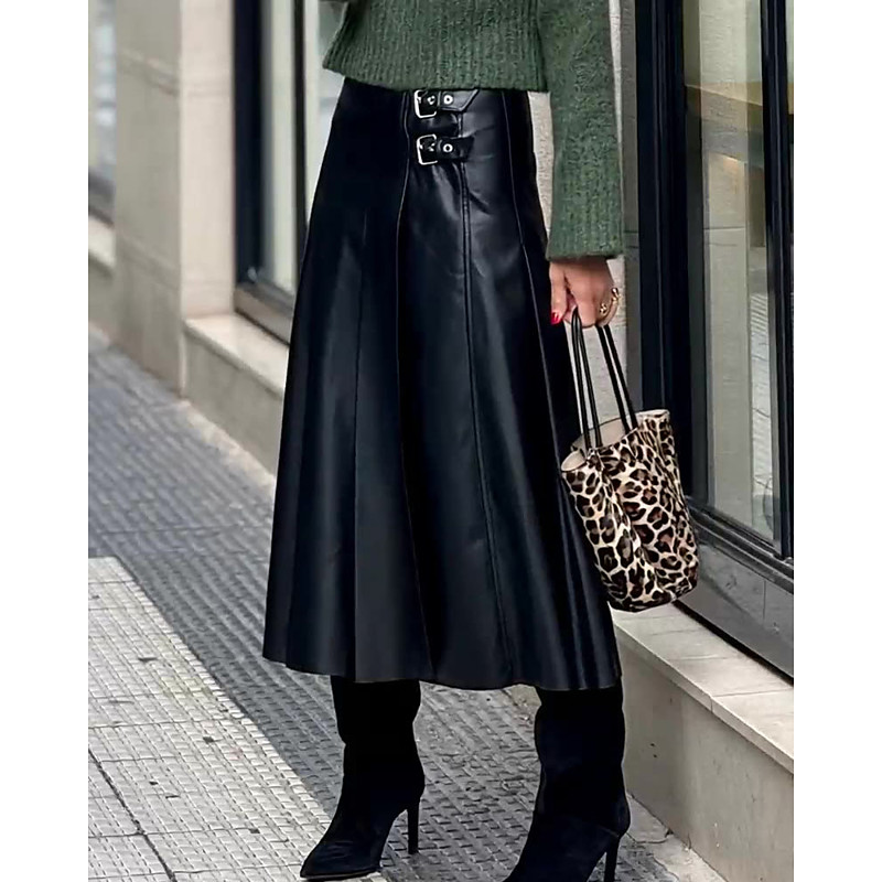 Women's Skirt A Line Elegant Fashion Midi Mid Rise Skirts Plain Ruched Micro-elastic Street Daily Black Fall Faux Leather Polyester