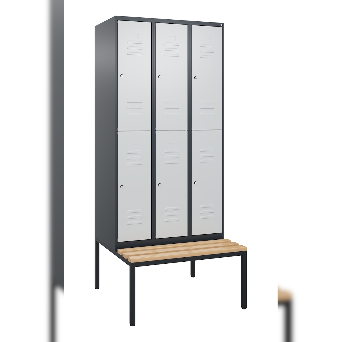 C+P Spind Classic PLUS, Buche untergebaute Sitzbank-Harthol, 6 Abteile, HxBxT 212x90x82cm, Zylinderschloss, Anthrazit/Hellgrau von PROREGAL