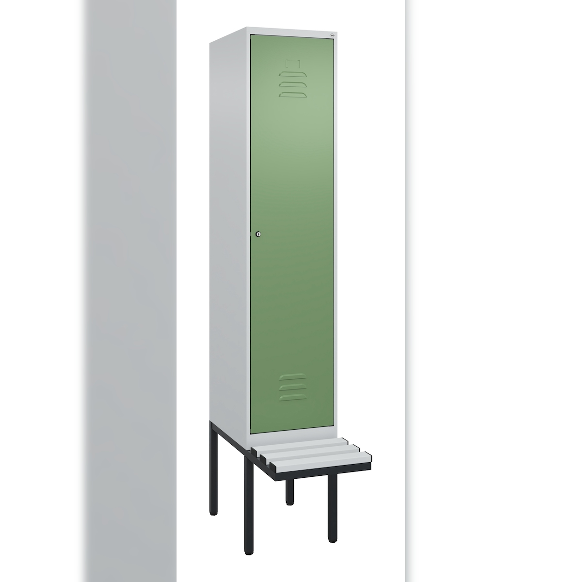 C+P Spind Classic PLUS, Kunststoff schwebende Sitzbank, 1 Abteil, HxBxT 212x40x82cm, Zylinderschloss, Hellgrau/Resedagrün von PROREGAL