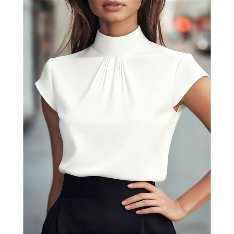 Women's Shirt Elegant Satin Summer Tops Plain Elegant Vintage Ladies Short Sleeve High Neck Regular Tops Daily Work Holiday Ruched Patchwork Draped Black White Purple Summer Spring