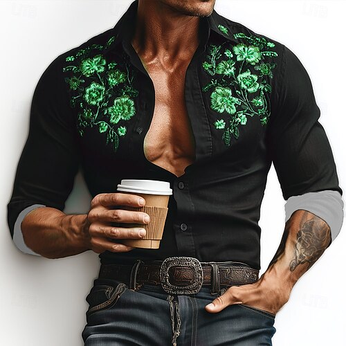 Per uomo Stampa Floreale Ferro di cavallo Fiori Camicia Camicia Western Camicia da cowboy Manica Lunga Vintage Retrò All'aperto Vacanza Primavera Autunno Collo ripiegato Stampa 3D Camicia tipo lino
