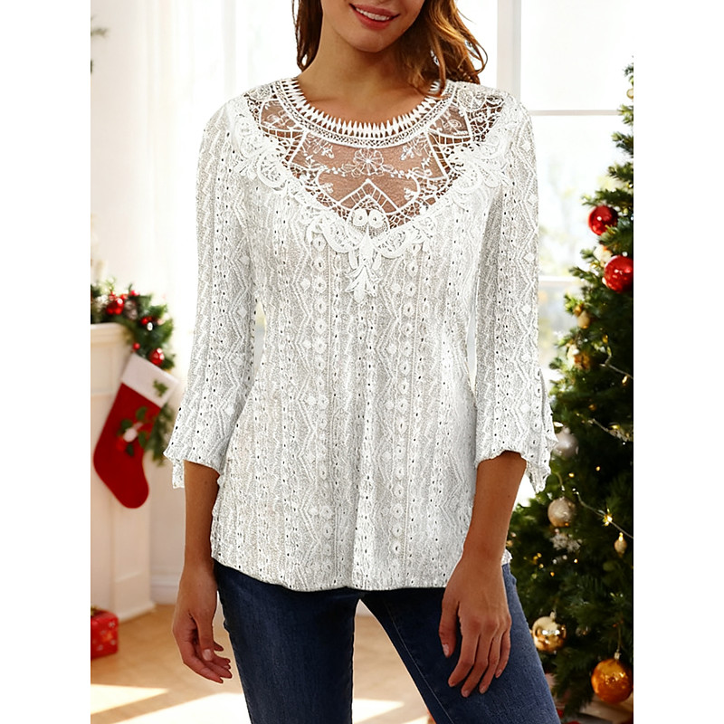 Christmas Women's Blouse Solid Color Elegant Stylish Basic 3/4 Length Sleeve Crew Neck Regular Tops Daily Lace Patchwork White Pink Spring Fall Winter