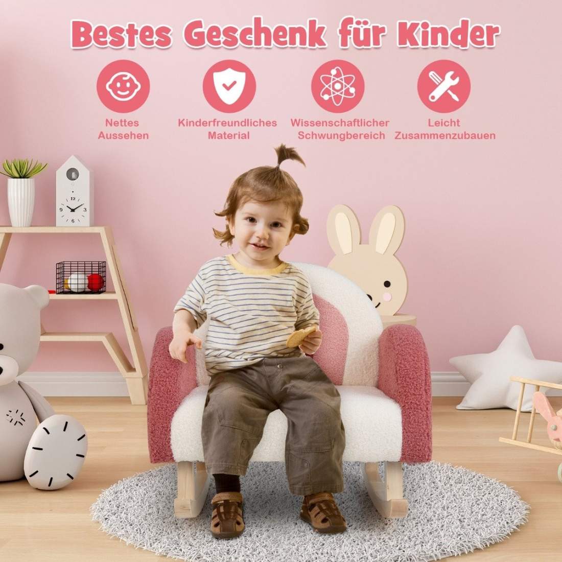 Barne gyngestol teddy plysj lenestol med gyngeben laget av poppel rødt