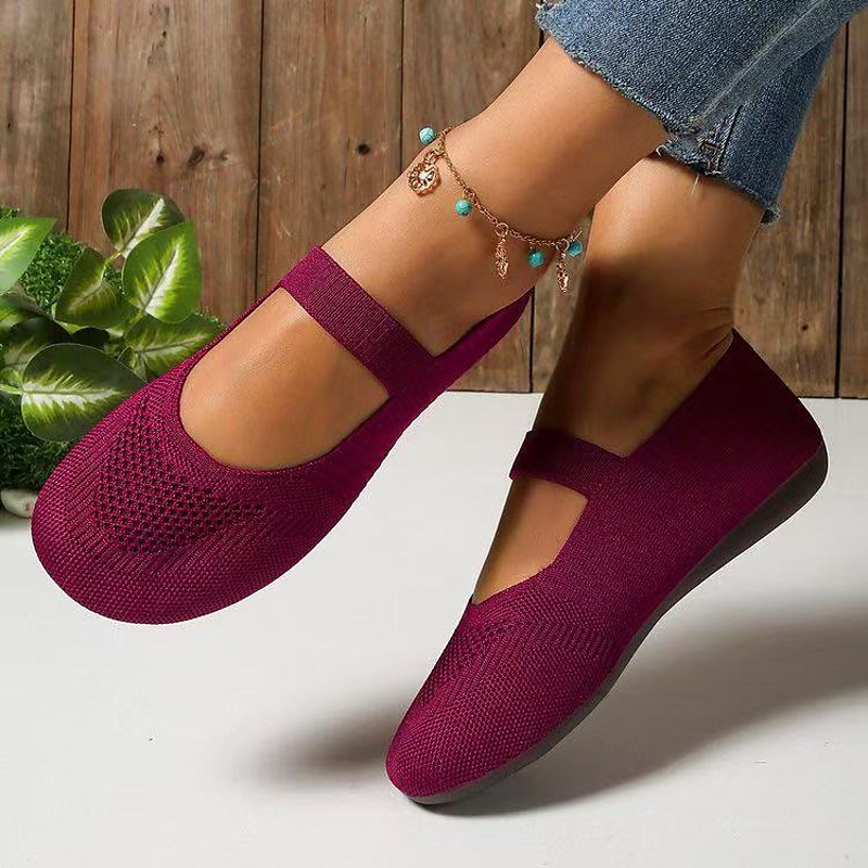 Women's Breathable Knit Fabric Mary Jane Flats – Comfortable Elastic Strap Slip-On Ballet Shoes for Daily Wear