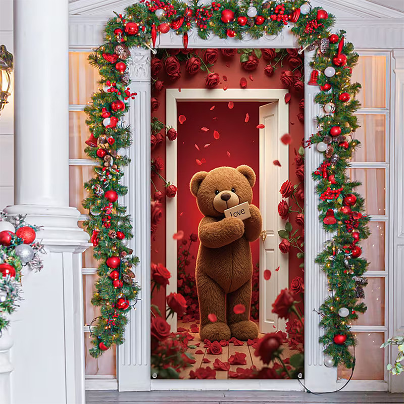 Valentine's Day Posters Door Cover Outdoor Banners Little Bear Love Heart Cute Romantic 3D Party Dorm Shooting Backgrounds Front Door Marriage Proposal Decoration Home Decor