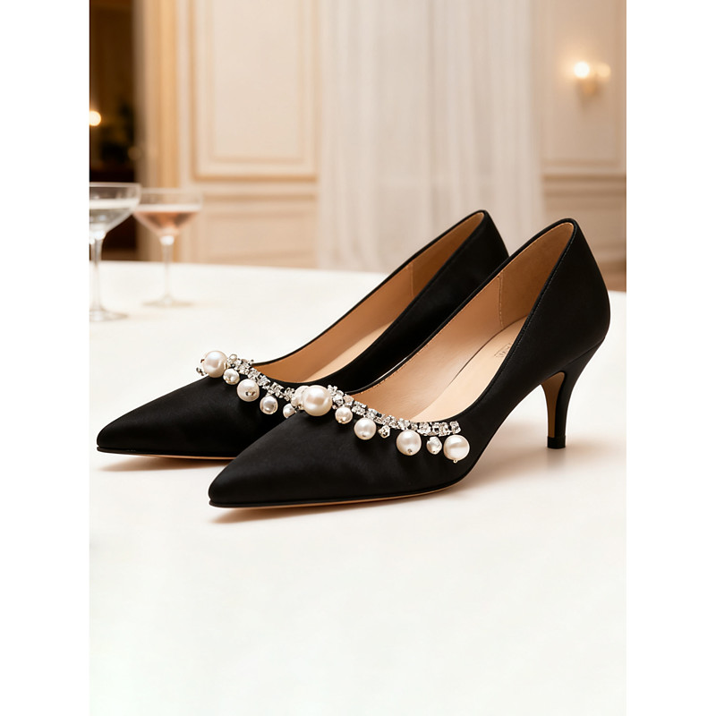 Women's White Satin Pearl Embellished Heels - Elegant Pointed Toe Low Heel Pumps for Wedding, Party or Formal Evening Events