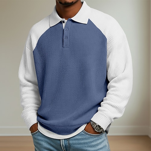 Per uomo Top a Maglia a Coste Testurizzato Streetwear Casuale Bavero Manica Lunga Essenziale Moderno Semplice Bottoni Primavera Autunno Tutte le stagioni Vestibilità aderente Blu Bianco Blu marino