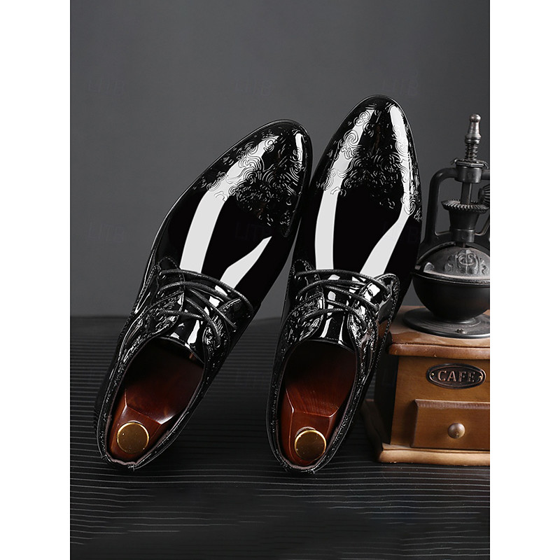 Men's Black Patent Leather Lace-up Shoes with Embossed Detailing - Premium Footwear for Evening Wear and Upscale Gatherings and Weddings