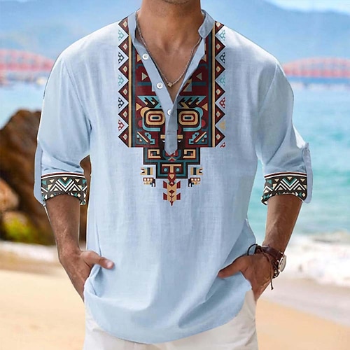 Per uomo Motivo Geometrico Tribale Camicia Camicia con Bottoni Maglia Henley Manica Lunga Vintage Retrò Casuale Vacanza Estate Primavera Collo alla coreana Colletto Mao Stampa 3D Camicia tipo lino
