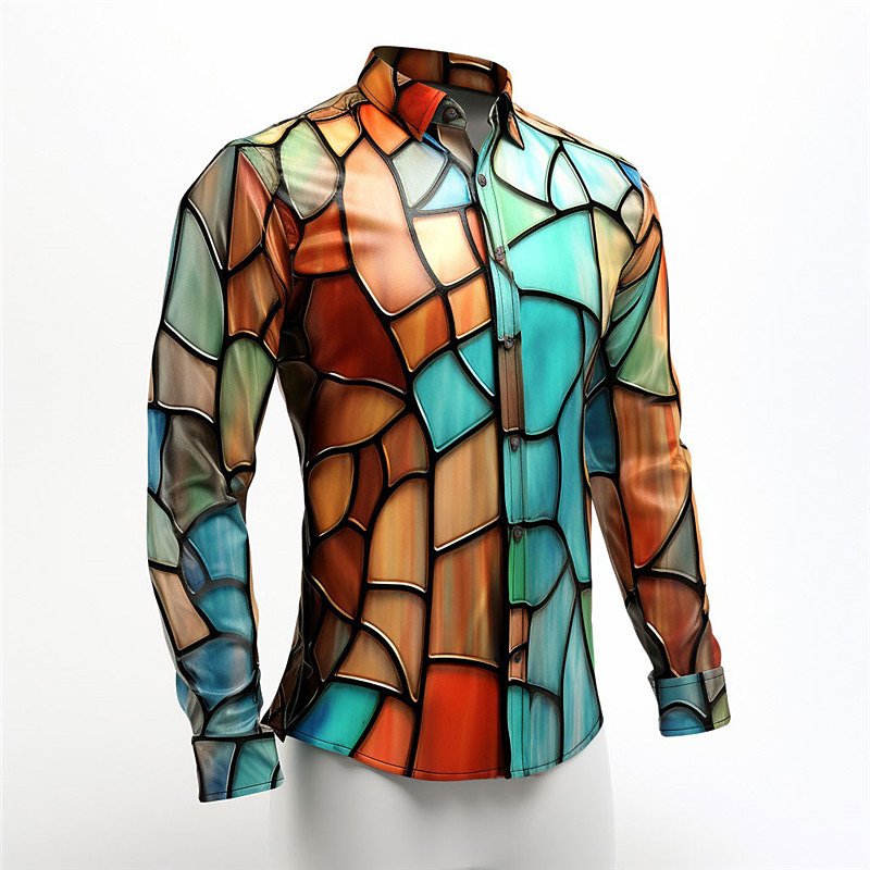 Men's Colorful Color Block Shirt Long Sleeve Artistic Abstract Daily Wear Going out Fall Winter Turndown Print Button-Down Blue Yellow Red Mint Green Orange