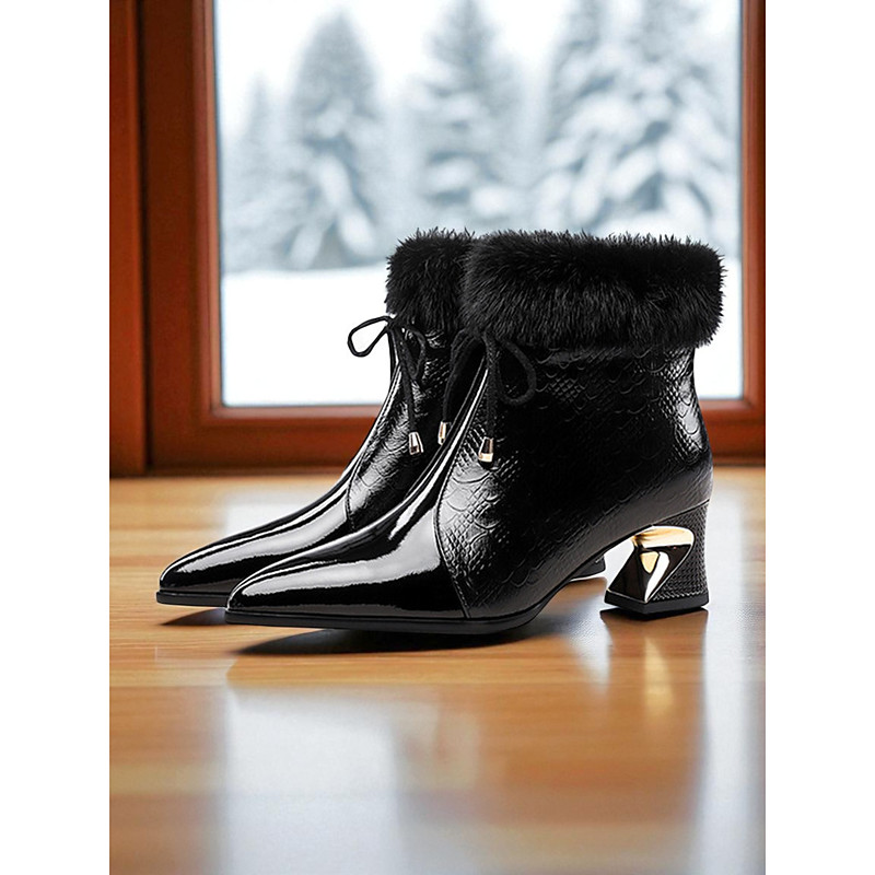 Women's Genuine Leather Ankle Boots with Mink Fur Trim, Patent Spliced Pointed Toe Block Heels, Luxury Winter Party Evening Shoes