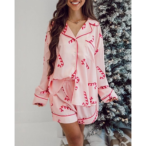 Per donna Pigiama Abbigliamento da Casa Set Pigiama Casual Colore Puro Elastico in vita Shorts Natale Vacanza Casa Manica Lunga Colletto a Camicia Rosa Verde Autunno Inverno Vestibilità comoda