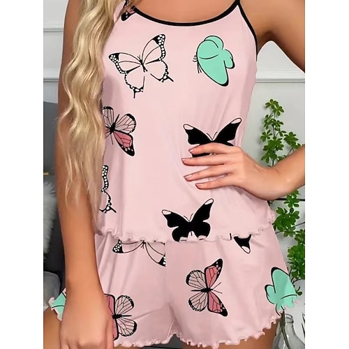 Per donna Set Pigiama Casual Comfort Farfalla Elastico in vita Shorts Quotidiano Casa Senza Maniche Spalline Blu Rosa Beige Estate Primavera Vestibilità regolare