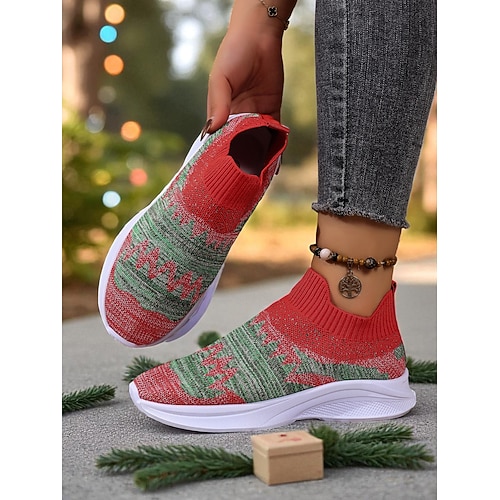 scarpe da ginnastica da donna in maglia rossa e verde: scarpe da corsa leggere e traspiranti, slip-on, per sport, passeggiate, feste di Natale e outfit casual