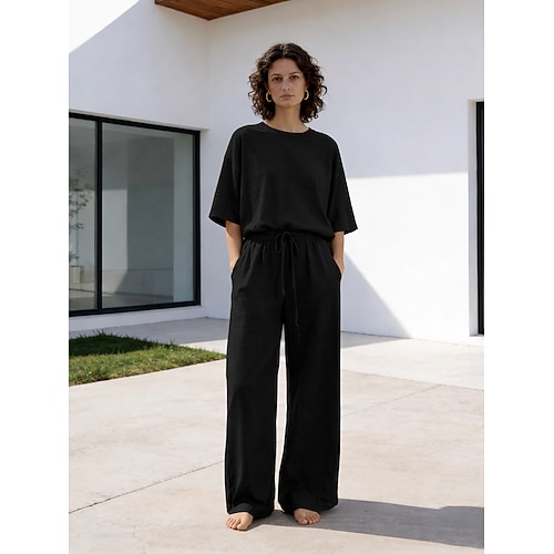 15% lino set da donna in lino misto lino set due pezzi basic colore puro tasca elastico in vita maglietta pantaloni strada quotidiano manica lunga girocollo nero bianco blu navy marrone chiaro blu estate primavera